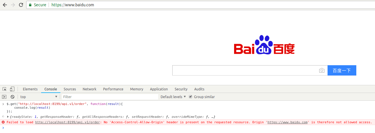 接口地址是 http://localhost:8199/api.v1/order ,当然这个接口是不允许跨域的。我们打开一个不同的域名,例如:百度首页(正好用了 jQuery,方便调试),然后按 F12 打开开发者面板,在 console 下执行以下 AJAX 请求: