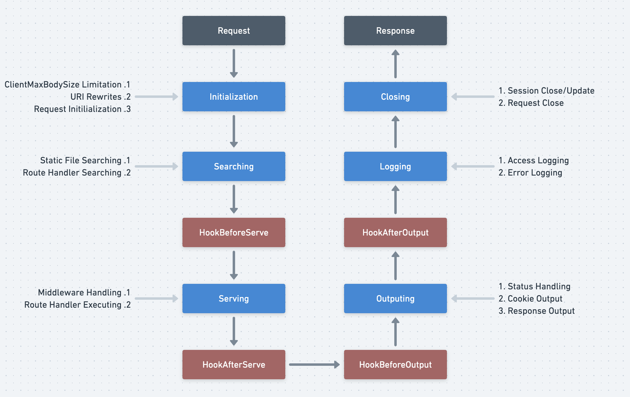 中间件( Middleware)与事件回调( HOOK)是 GF 框架的两大流程控制特性,两者都可用于控制请求流程,并且也都支持绑定特定的路由规则。但两者区别也是非常明显的。