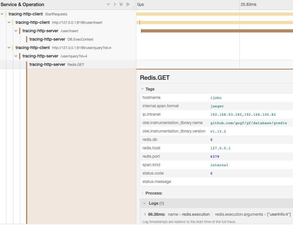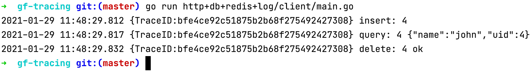 我们再来看一个相对完整一点的例子,包含几个常用核心组件的链路跟踪示例,示例代码地址: https://github.com/gogf/gf-tracing/tree/master/examples/http_db_redis_log