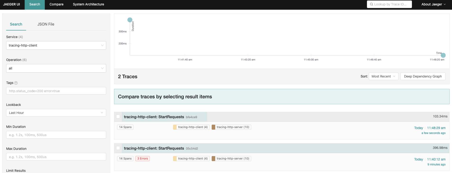 可以看到在这里出现了两个服务名称: tracing-http-clienttracing-http-server,表示我们这次请求涉及到两个服务,分别是HTTP请求的客户端和服务端,并且每个服务中分别涉及到 2span 链路节点。
