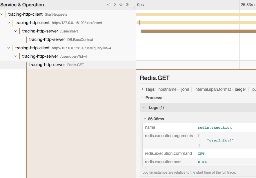 可以看到,客户端提交的 baggage 已经被服务端成功接收到并打印返回。并且客户端在输出日志内容的时候也同时输出的 TraceId 信息。 TraceId 是一条链路的唯一ID,可以通过该ID检索该链路的所有日志信息,并且也可以通过该 TraceIdJaeger 系统上查询该调用链路详情。