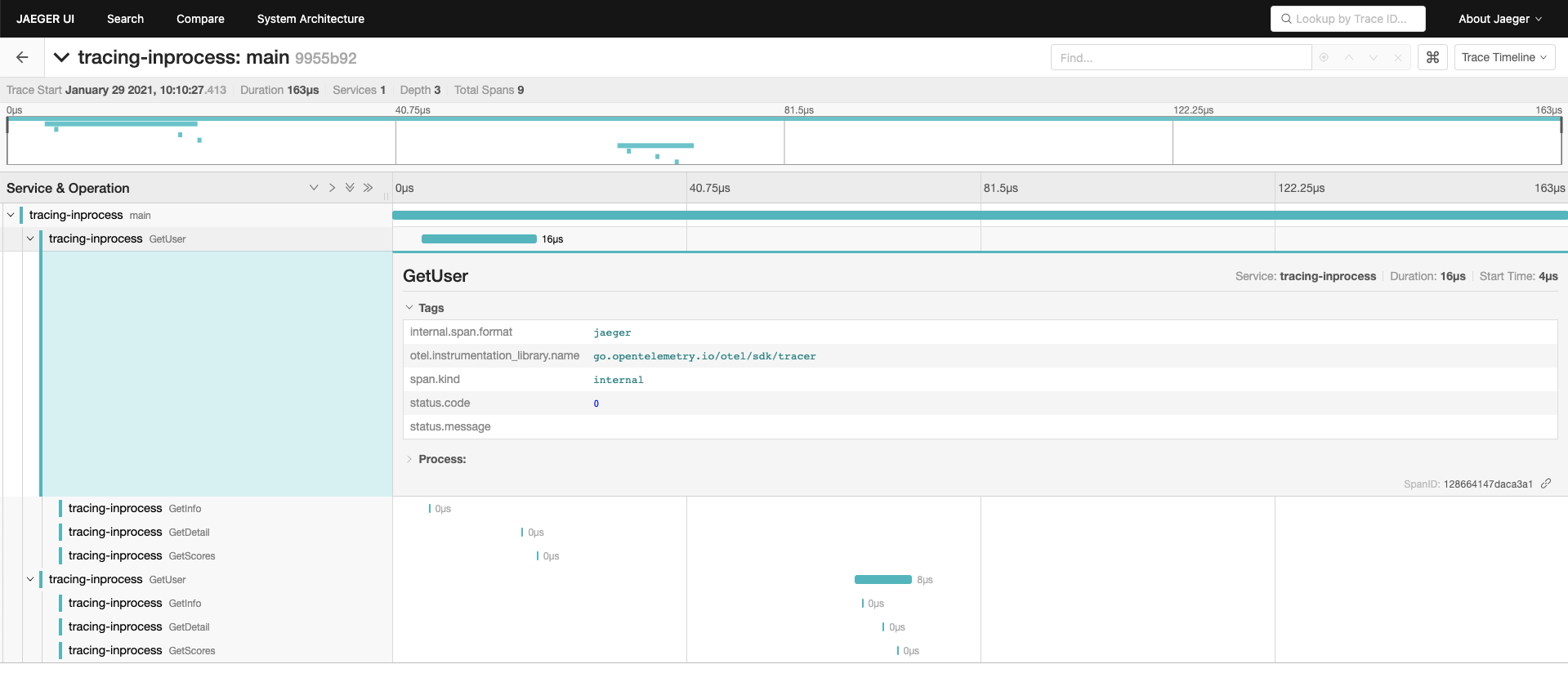 其中的 tracing-inprocess 是我们 tracer 的名称,该名称往往是服务名称,由于我们这里只有一个进程和一个 tracer,因此这里只看得到一个服务名称。其中的 main 为我们创建的 root span 名称,其他的 span 为基于该 root span 创建的子级 span。由于我们在程序中调用了两次 GetUser 方法,因此这里也展示了两次 GetUser 方法的调用。每一次 GetUser 调用的内部又分别去调用了 GetIndo、GetDetail、GetScores 三个方法,方法间的调用层级关系展示得非常清晰明了,并且每个方法的调用时长都可以看得到。
