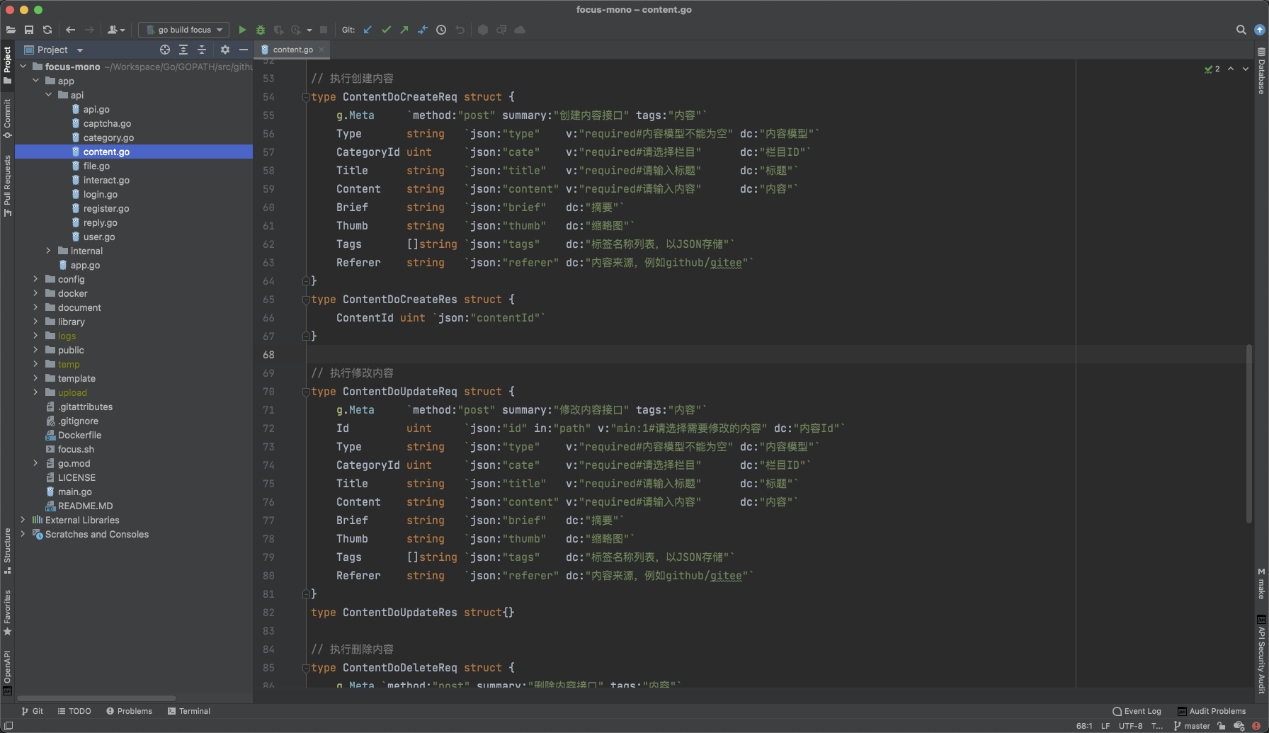 在规范化路由注册中,非常重要的是请求/返回结构体的定义,在该结构体不仅仅包含了输入参数的定义,也包含了接口的定义,特别是路由地址、请求方法、接口描述等信息。为保证命名规范化,输入数据结构以XxxReq方式命名,输出数据结构以XxxRes方式命名。即便输入或者输出参数为空,也需要定义相应的数据结构,这样的目的一个是便于后续扩展,另一个是便于接口信息的管理。关于结构体中涉及到 OpenAPIv3 协议的标签介绍请查看后续章节。