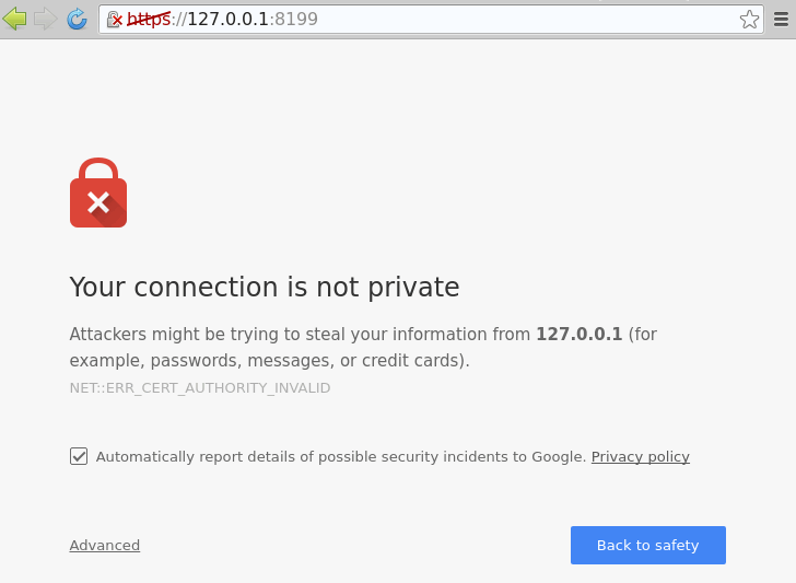 可以看到,我们直接将之前生成的证书和秘钥文件地址传递给 EnableHTTPS 即可,通过 s.SetPort(8199) 设置HTTPS的服务端口,当然我们也可以通过 s.SetHTTPSPort(8199) 来实现,在单一服务下两者没有区别,当WebServer需要同时支持HTTP和HTTPS服务的时候,两者的作用就不同了,这个特性我们会在后面介绍。随后我们访问页面 https://127.0.0.1:8199/ 来看一下效果: