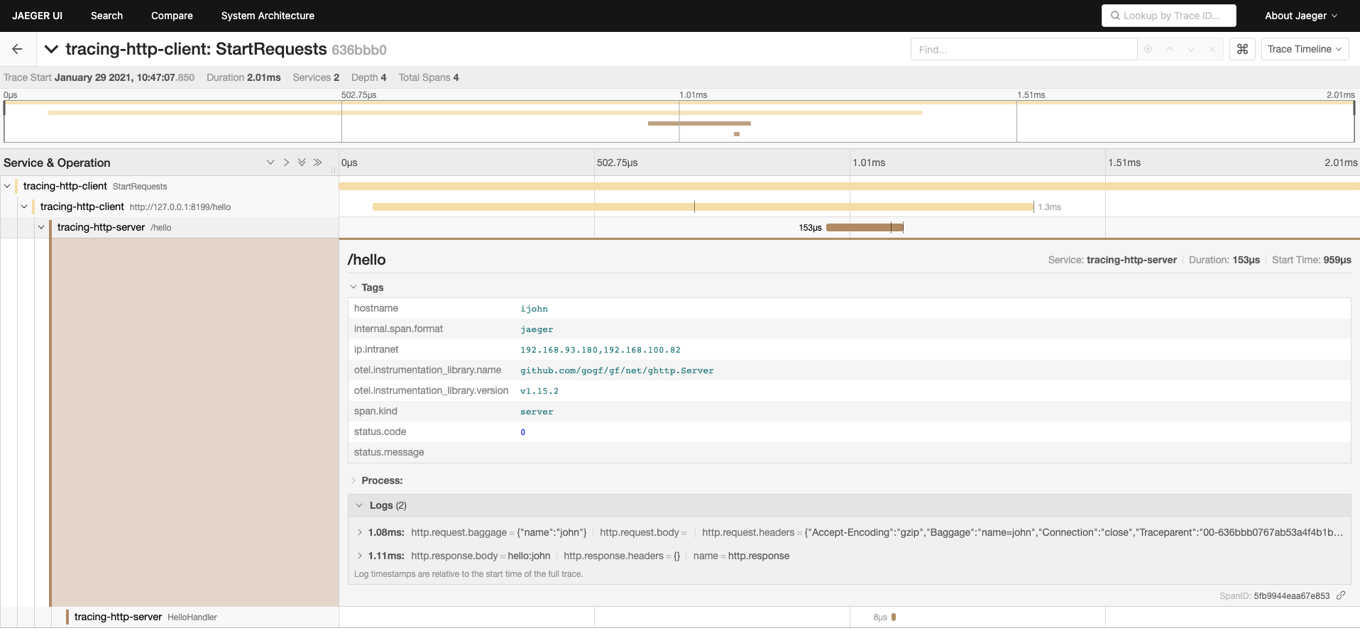 可以看到在这里出现了两个服务名称: tracing-http-clienttracing-http-server,表示我们这次请求涉及到两个服务,分别是HTTP请求的客户端和服务端,并且每个服务中分别涉及到 2span 链路节点。