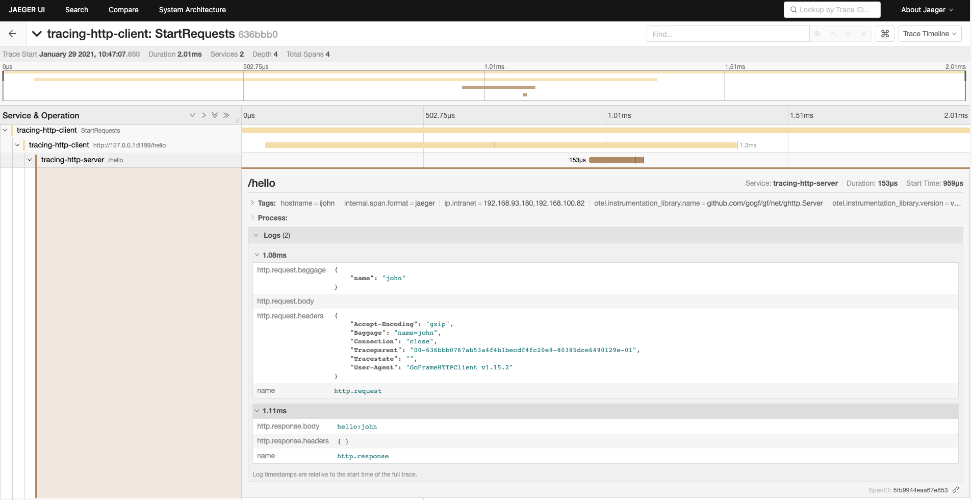 可以看到,客户端提交的 baggage 已经被服务端成功接收到并打印返回。并且客户端在输出日志内容的时候也同时输出的 TraceId 信息。 TraceId 是一条链路的唯一ID,可以通过该ID检索该链路的所有日志信息,并且也可以通过该 TraceIdJaeger 系统上查询该调用链路详情。