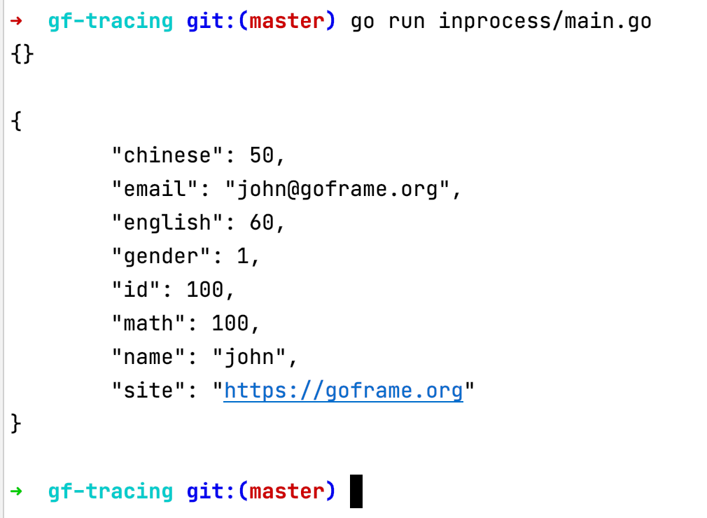 单进程的链路跟踪即进程内方法之间的调用链关系。这种场景的跟踪没有涉及到分布式跟踪,比较简单,以该示例作为我们入门的一个例子吧。示例代码地址: https://github.com/gogf/gf/tree/master/example/trace/inprocess