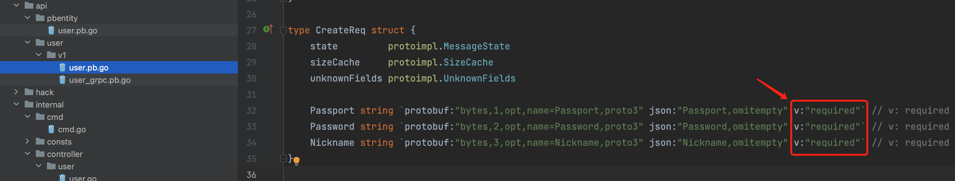 使用 gf gen pb/make pb 命令进行 proto 文件编译时,支持自动的标签注入。只需要通过注释的形式写到 proto 文件中,这些注释将会自动作为 dc 标签嵌入到结构体属性中。如果注释规则形如 xxx:yyy ,那么将会自动生成 xxx 的标签。例如: