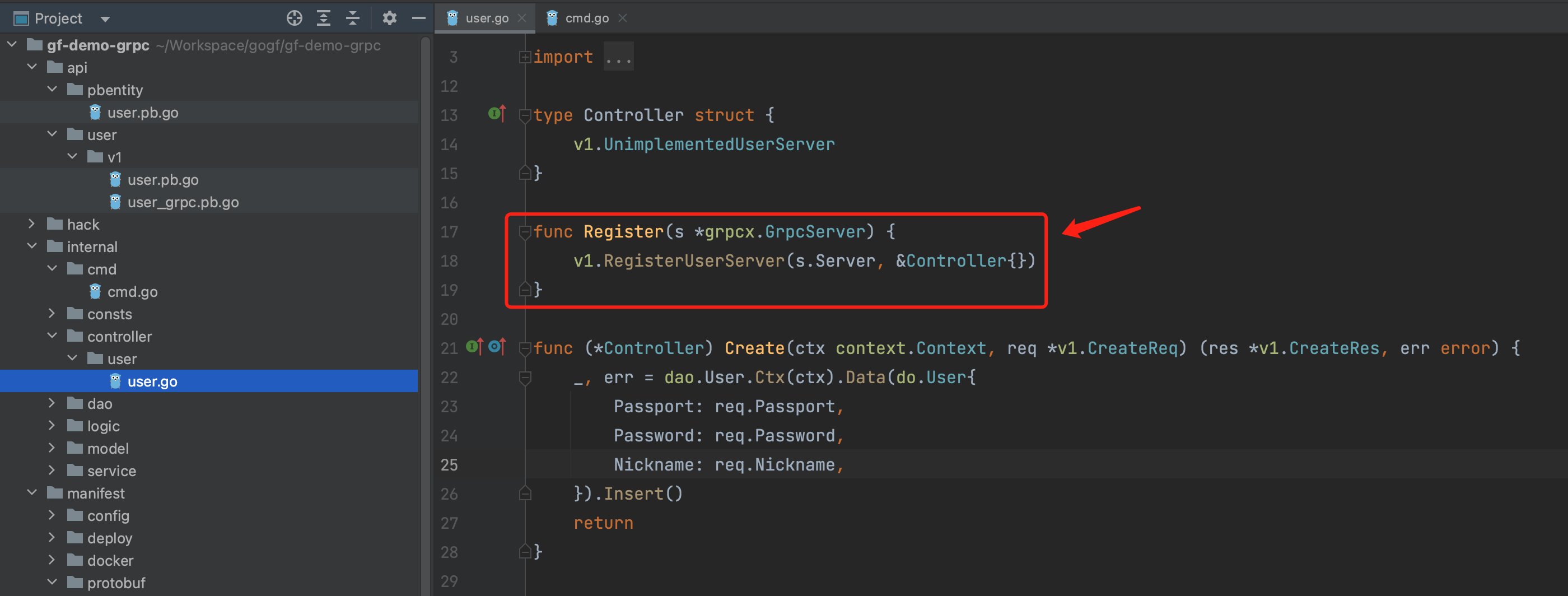 控制器用于 proto 定义的接口的具体实现,控制器可以通过命令自动生成,并自动生成 Register 方法,用于将具体实现注册到服务对象中。