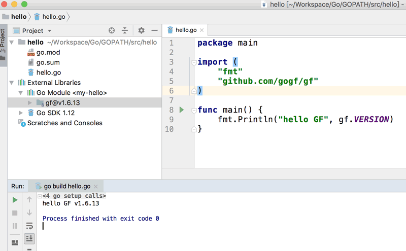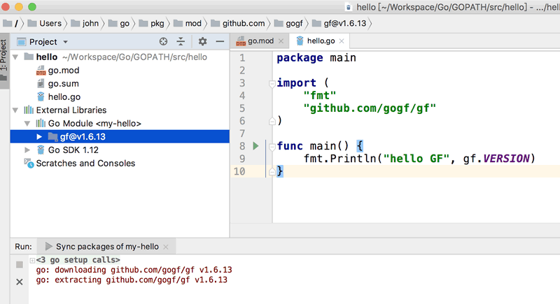 可以看到, GoFrame 框架已被自动下载成功,并在编译中被正常引入了。
