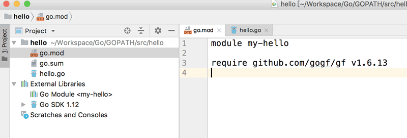 我们将之前的 hello world 项目做一些改变,增加一个 go.mod 文件(也可以在项目根目录下使用 go mod init 项目名称 命令初始化项目生成该文件),内容如下: