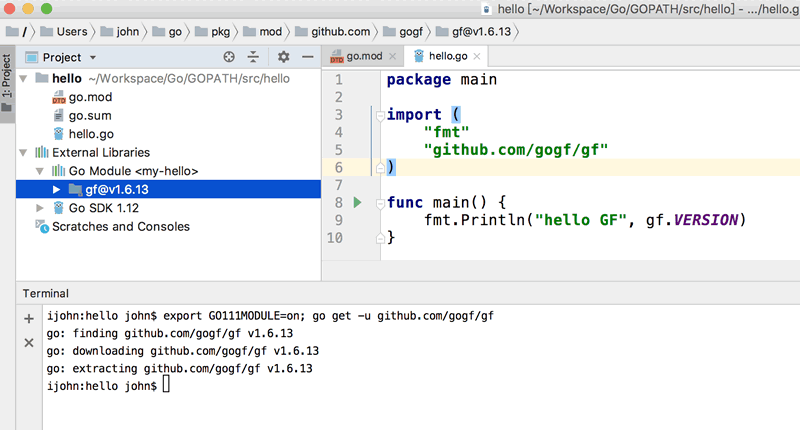 使用 go.mod 意即用 go.mod 进行项目依赖管理。我们有两种 go.mod使用方式IDE-vgo命令行 方式。以下我们通过下载使用 GoFrame 框架来演示如何使用这两种方式来管理依赖。