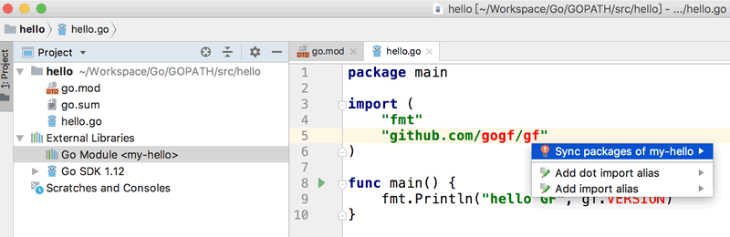 1. 请按快捷键 ⌥(option)+↩(return) 或者 鼠标右键, 选择 Sync packages of my-hello