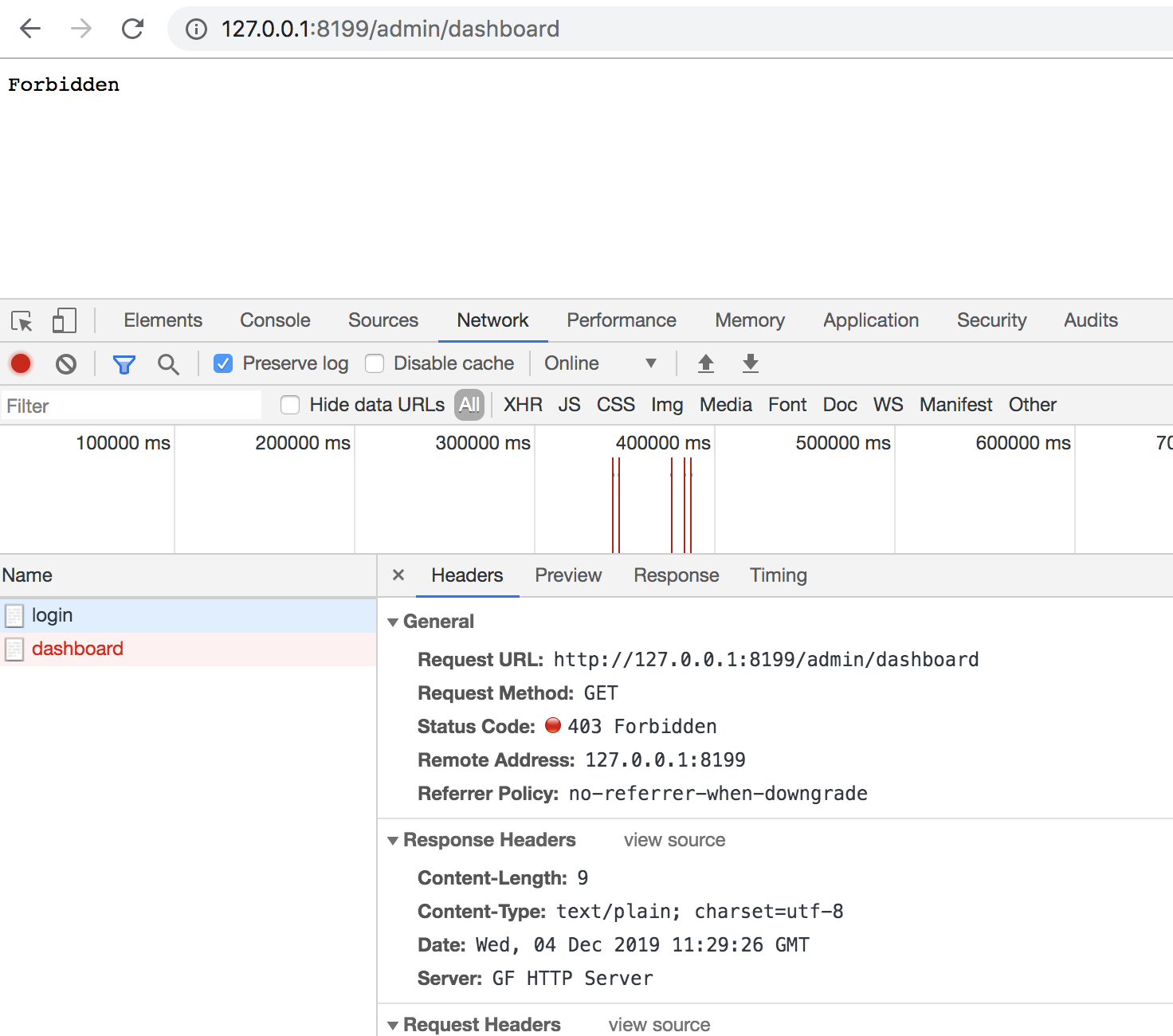 可以看到,只有 /admin/dashboard 路由的服务方法绑定了鉴权中间件 main.MiddlewareAuth,而 /admin/login 路由的服务方法并没有添加鉴权处理。 随后我们访问以下URL查看效果: