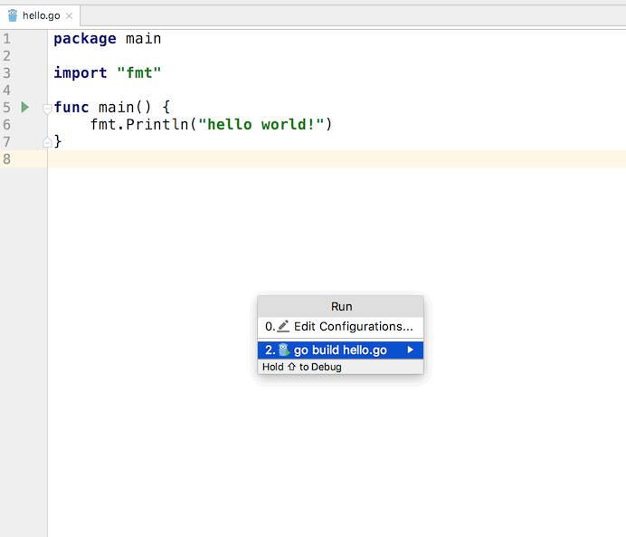 新建一个 go 文件,叫做 hello.go,并输入以下代码: