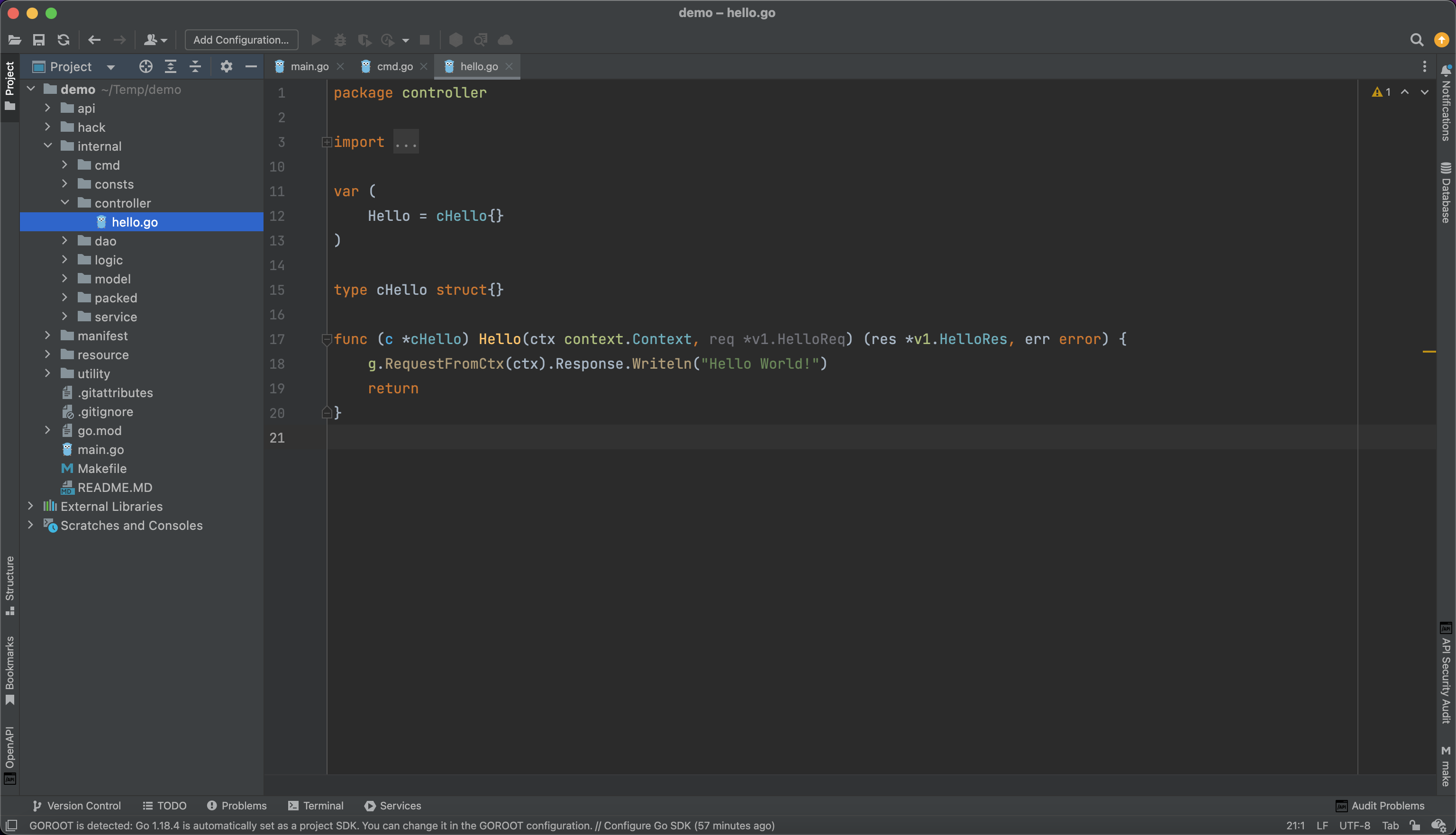 在项目模板中的路由对象 Hello 只有一个路由 Hello,仅用于模板示例作用。关于内部路由结构体的命名比较随意,大多数场景下我们简单地带了一个小写的前缀 c 表示 controller 的缩写。