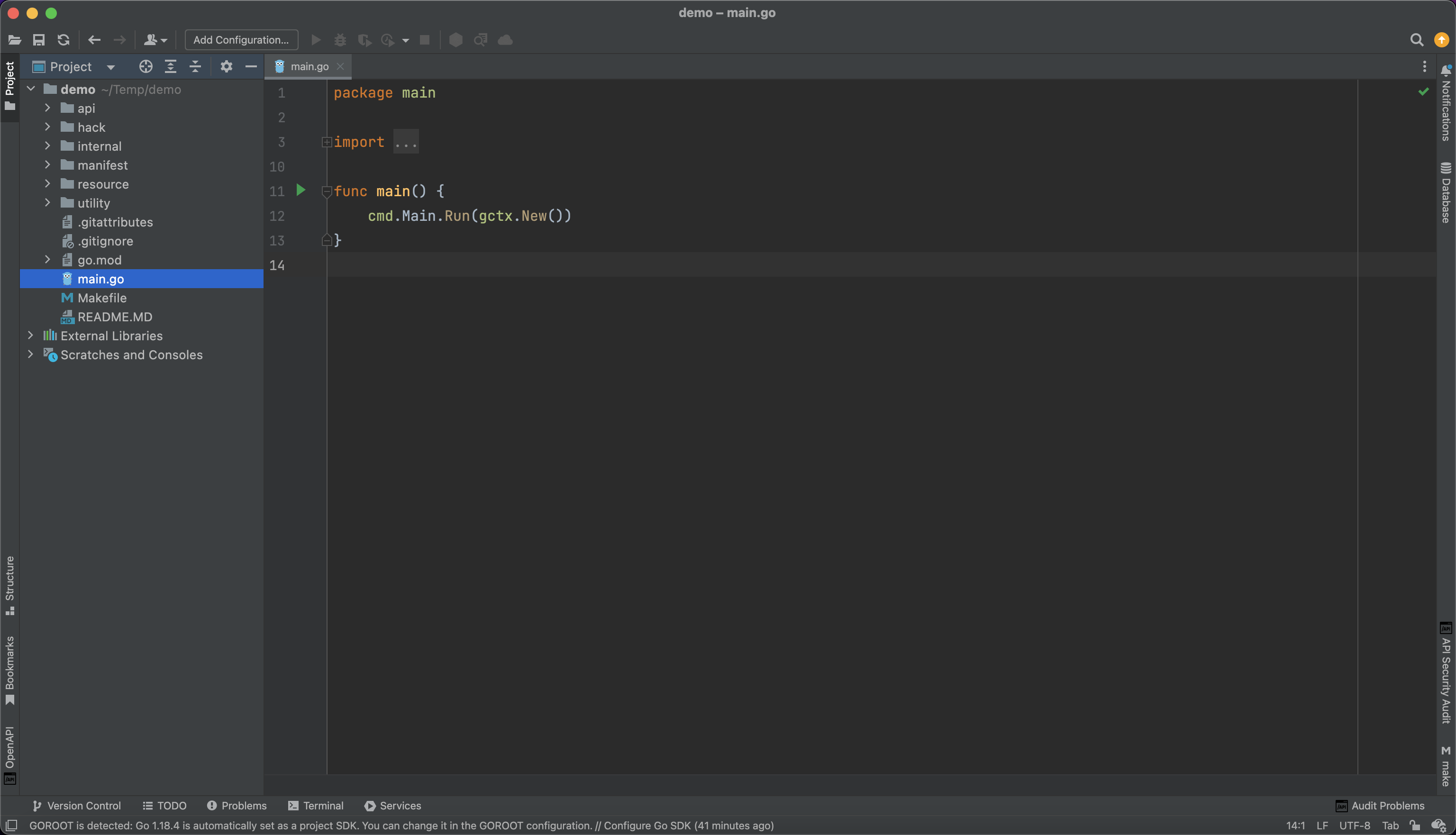 所有的程序入口都是由 main.go 进入,该文件主要是调用 internal/cmd 包的对应命令引导程序启动。在项目模板中,默认会执行 internal/cmd 包的 Main 对象 Run 命令引导程序启动。