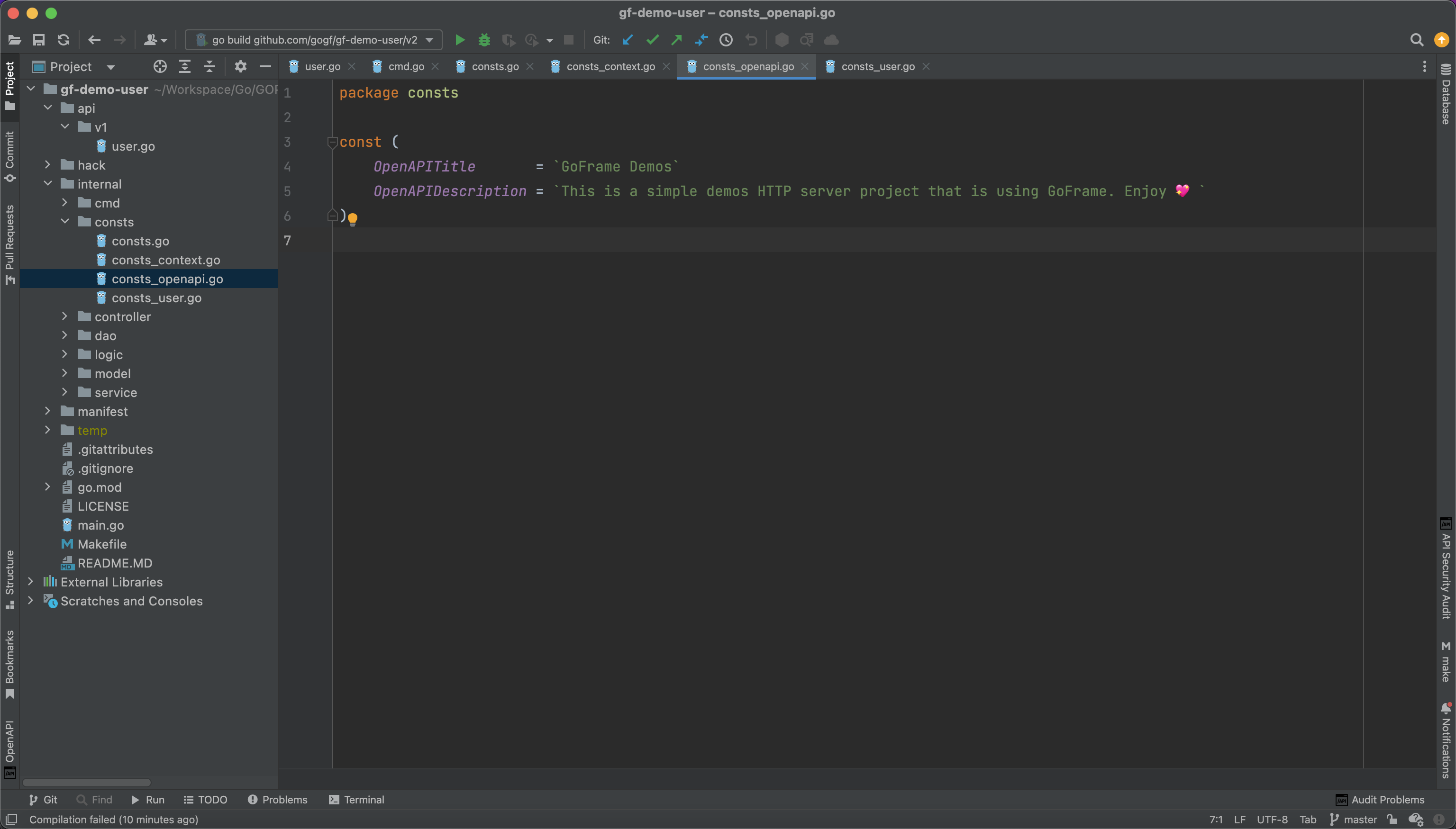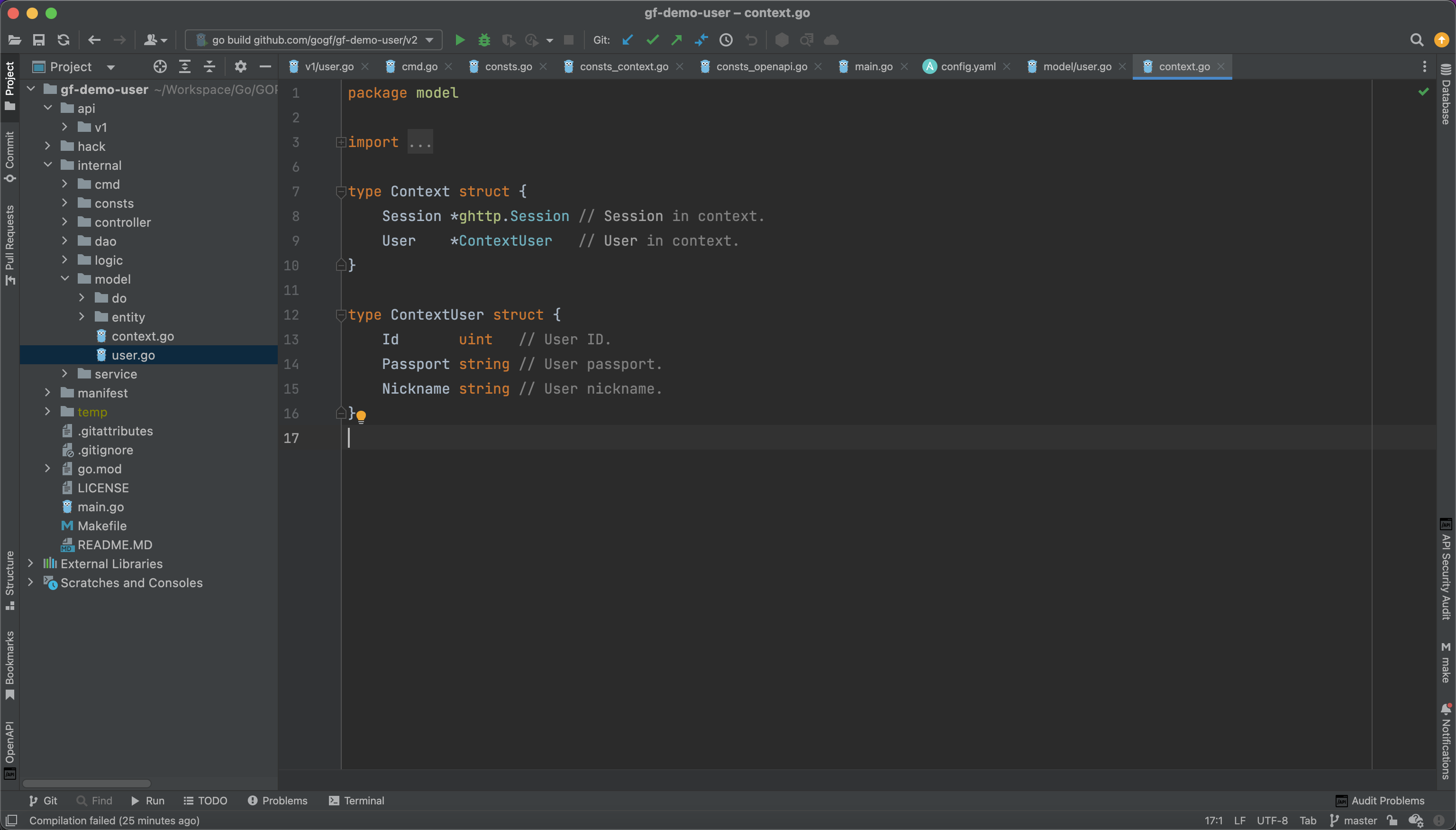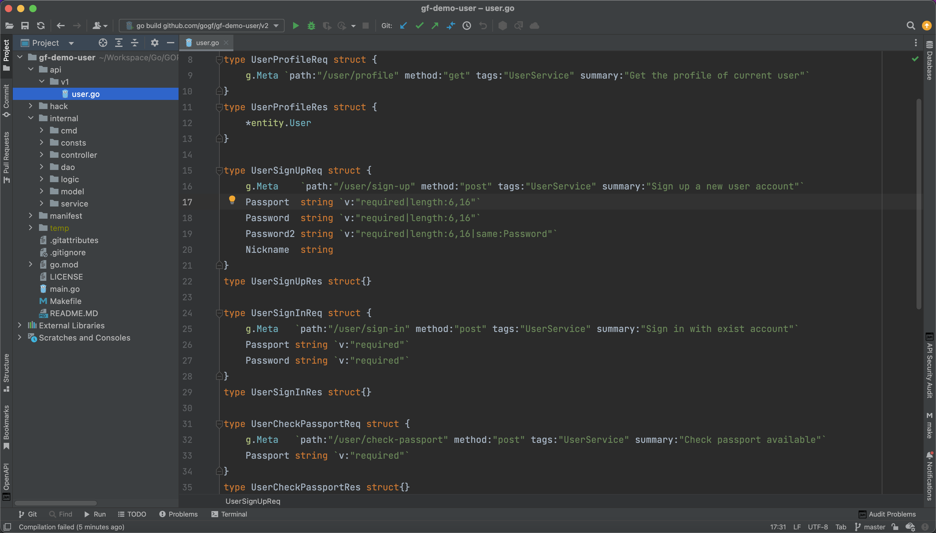 接口注册文件位于 api 目录下,由于该项目采用了规范路由注册方式,因此在API结构体的属性中包含一些标签。其中结构体属性的 v 标签表示校验规则,请求参数进入 HTTP Server 后将会被自动执行校验(框架有非常强大的数据校验组件,更详细的介绍请参考章节: 数据校验