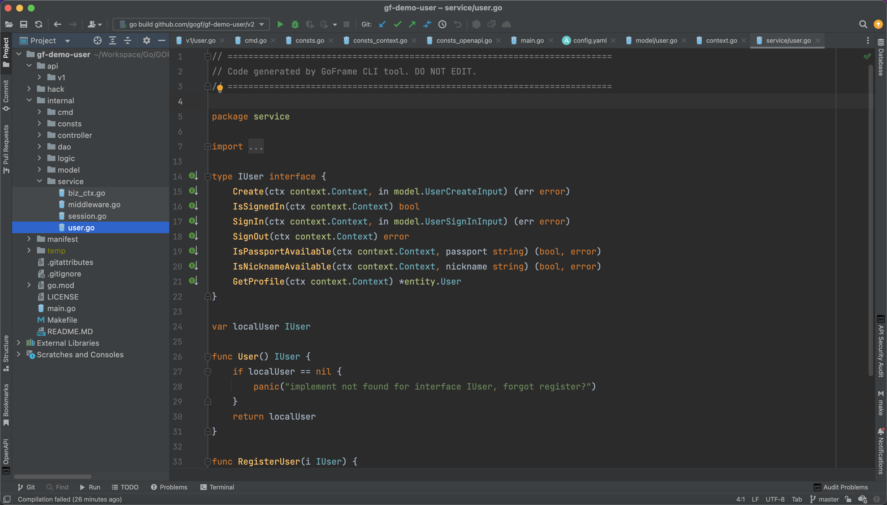 需要注意,在通过框架开发工具自动生成 service 层接口文件时,开发工具同时也会自动更新最外层的 main.go,自动增加 logic 引入,无需开发者操心。