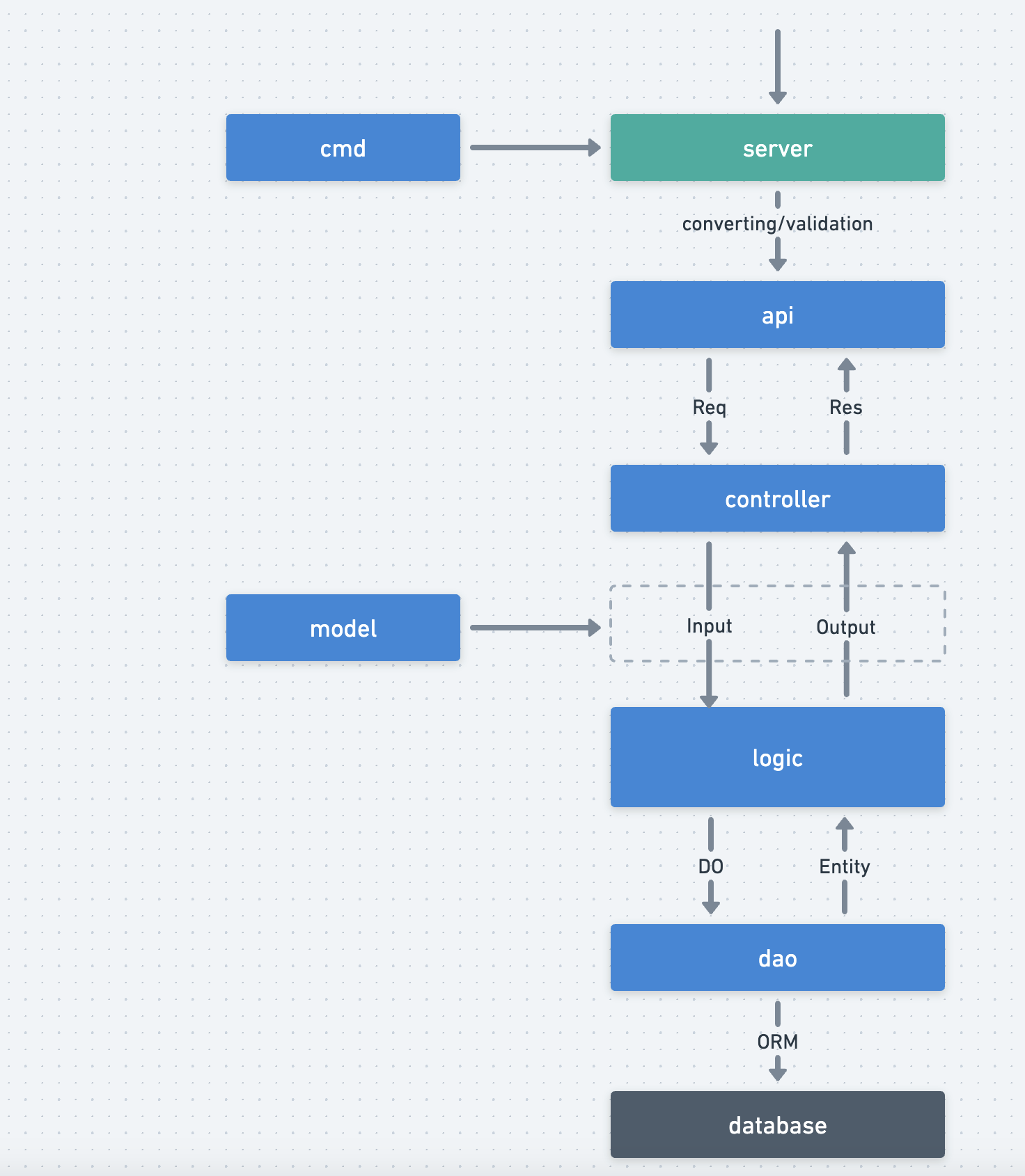 这是 GoFrame 框架针对 业务项目 的目录设计,主体的思想来源于三层架构,但在具体实现中,对其进行了一定的改进和细化使其更符合工程实践和时代进步。
