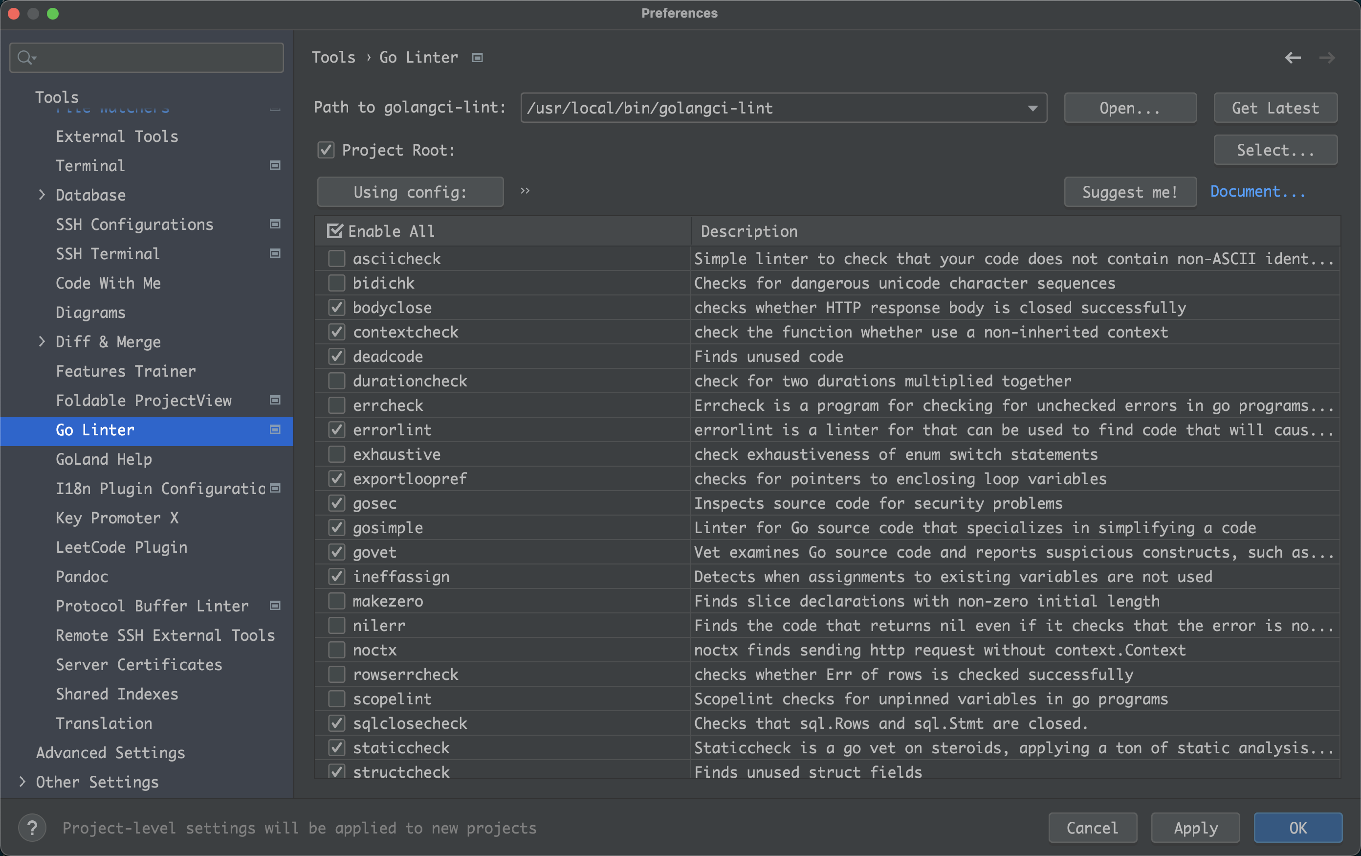 go Linter插件管理golangci-lint工具的配置,如下是go Linter的安装以及配置。